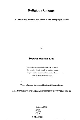 An explanatory model of religious change in small-scale subsistence societies is developed, in which it is argued that the relative balance of domination between neighbouring societies is a crucial factor in the development of stimuli for religious change. Societies which retain control over their productive resources exhibit relative satisfaction with their well-being and change is usually restricted to diffusion. However, in a colonial situation the well-being of the dominated people is threatened and they enter a crisis. This is characterized by a realization that their ritual practices no longer adequately control the superempirical universe, and by a reduction in their sense of self-worth and prestige. A common response is religious transformation and the resultant conversion movements can be conceived of as active constructions of more satisfying cultures in which attempts are made to re-impose control over the mystical universe and to regain prestige and self- worth. The mechanism used is intercultural sociality: the dominated people look to the colonizers for the secret of their perceived success but the difficulties of intercultural communication result in frequent misinterpretation. The model is used to explain religious change amongst the Enxet Indians of the Paraguayan Chaco. Prior to colonialism, change amongst the Enxet was limited to diffusion. However, post-1885 their land was invaded by the white man, plunging them into a crisis. Two independent conversion movements are examined and successfully explained by reference to the theoretical model. However, a third movement, conversion to Anglicanism, illustrates the influence of culturally-specific factors on the character of a movement. The Enxet, as immediate return hunter- gatherers, viewed the Anglican church as a "foraging resource" and the adoption of Anglicanism by a minority of Enxet was little more than a technique of gaining access to the economic benefits available.