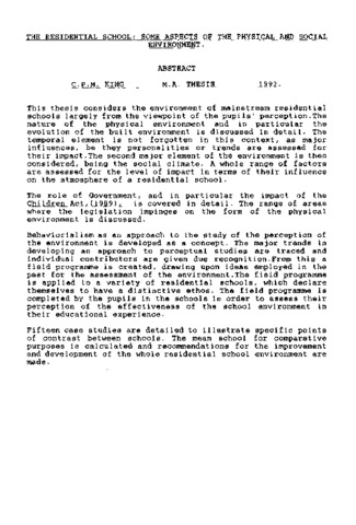 This thesis considers the environment of mainstream residential schools largely from the viewpoint of the pupils' perception. The nature of the physical environment and in particular the evolution of the built environment is discussed in detail. The temporal element is not forgotten in this context, as major influences, be they personalities or trends are assessed for their impact. The second major element of the environment is then considered, being the social climate. A whole range of factors are assessed for the level of impact in terms of their influence on the atmosphere of a residential school. The role of Government, and in particular the impact of the Children Act.(1989), is covered in detail. The range of areas where the legislation impinges on the form of the physical environment is discussed. Behaviorialism as an approach to the study of the perception of the environment is developed as a concept. The major trends in developing an approach to perceptual studies are traced and individual contributors are given due recognition. From this a field programme is created, drawing upon ideas employed in the past for the assessment of the environment. The field programme is applied to a variety of residential schools, which declare themselves to have a distinctive ethos. The field programme is completed by the pupils in the schools in order to assess their perception of the effectiveness of the school environment in their educational experience. Fifteen case studies are detailed to illustrate specific points of contrast between schools. The mean school for comparative purposes is calculated and recommendations for the improvement and development of the whole residential school environment are made.