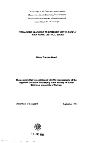 The central aim of this thesis is to develop an understanding of variation in access to domestic water supply in a semi-arid, non-riverain area of Sudan. En Nahud District, in North Kordofan Province, was selected for study because it has existing water supply problems and contains distinct spatial variations in geology, which affects the potential for development of underground water resources. Fieldwork in Sudan was carried out between July and December 1988, and information was collected from a range of sources using a variety of methods. The latter included: semi-structured household interviews conducted with women; key informant interviews; observation; and various published and unpublished articles and data sets. In the thesis, the first chapter introduces the national and international context of this study. Past and present water supply development policies and projects in the Sudan are outlined, and set against the goals of the International Drinking Water Supply and Sanitation Decade. In the second chapter, the research methodology is discussed. Attempt was made to overcome the several spatial, temporal social and economic biases which have occurred in other studies. In the third chapter, the thesis is placed in the physical and socio-economic context of the Province, and the dynamic relationship between water supply and demand is outlined. The following three chapters focus upon the primary constraints which limit access to domestic water supply: water availability; at-source costs; and transportation costs. The components of each, and the way in which they operate to restrict access, are investigated in relation to varying family resources and requirements. The borrowing of carriage resources and the purchase of transportation services are examined as strategies for overcoming families' internal collection-capacity constraints. Finally, seasonal outmigration is discussed as an important response to inadequate access to water supply. In its conclusion, this thesis shows clearly the importance of examining access to water at the family scale: inter-household variations, such as the ownership of carriage animals and varying labour resources, are shown to be influential in affecting household water supply strategies.