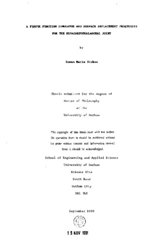 Joint replacement surgery in the treatment of arthritic disease is now commonplace and on the whole very successful. Research into the design and development of prostheses has made major advances since the 1940s resulting in complex devices for almost all articulating joints of the body. In this thesis, a programme of work to design and test a surface replacement prosthesis for the metacarpophalangeal joint is presented. The anatomy and kinematics of the MCP joint are discussed for both normal and abnormal joint function and, based on these considerations, the design of a new surface replacement prosthesis is described. Various materials are explored with respect to their biocompatibility, durability and ease of fabrication with special attention being paid to one material - a new cross linked ultra-high molecular weight polyethylene - which is tested for wear and assessed for durability in long-term prototype tests. A finger function simulator is detailed which was designed and developed during this research programme, and results of tests on bone replicas, Swanson Silastic implants and prototypes of the new design are presented. The simulator can be easily modified to accept any MCP joint prosthesis for bench testing. Finally the stress response of the prototype design is studied using finite element analysis and modifications to the implant design and bone preparation are suggested.