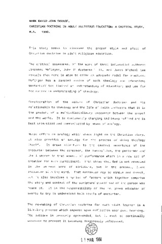 This study seeks to discover the proper style and place of Christian doctrine in adult religious education. The critical assessment of the work of three influential authors: Johannes Hofinger, John H Westerhoff III and James Michael Lee reveals that none is able to offer an adequate model for practice. Hofinger has a limited vision of both theology and education; Westerhoff too limited an understanding of education; and Lee far too narrow an understanding of theology. Consideration of the nature of Christian doctrine and its relationship to theology and the life of faith indicates that it is the product of a multi-disciplinary encounter between the gospel and the world. It is continually changing and being refined and is best understood and communicated by means of analogy. Music offers an analogy which sheds light on the Christian story. It also provides an analogy for the process of doing theology itself. It draws attention to the central importance of the encounter between the composer, the composition, the performer and the listener in that moment of performance which is a new act of creation for each participant. This shows that God is not revealed in the un-read word of scripture, but in the present, lived encounter with the word. That encounter may be simple and direct, but it also involves a myriad of factors which together comprise the story and context of the scripture itself and of the person who reads it. It is the responsibility of the religious educator of adults to try to understand both levels of encounter. The re-making of Christian doctrine for each adult learner is a life-long process which depends upon reflection upon past learning. Its outcome is properly open-ended, but it must be continually assessed to prevent it becoming dangerously unfocussed.