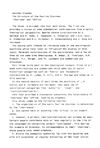 The Study is divided into four main parts. The first one provides a review of some substantial contributions from a mainly theological perspective. Beside others contributions by A. Harnack and R. Sohm, E. Kasemann, E. Schweizer and J.D.G. Dunn, H. Ridderbos and B.H. Streeter, R. Schnackenburg and H. Kung are reviewed. The second part intends to introduce some of the sociological positions which have later on influenced the studies on this topic. Relevant contributions of the sociologists, and a few of them at the same time theologians, M. Weber, E. Troeltsch, H.R. Niebuhr, P.L. Berger, and Th. Luckmann are summarized and discussed. Part three turns back to the theological context. First of all some contributions are summarized which make use of socio- historical categories such as "family" and "household". Contibutions by E. Judge, C. Hill, and G. TheiBen are taken up in this section. In the second section of part three the positions of J.H. Schutz and B. Holmberg are reviewed. They make use of sociological categories like "authority", "power", and "institutionalization". Part four provides a discussion concerning the relationship of 'charisma' and ‘office’ looking at prophecy. This study comes to the following results: 1. The organization of the early Pauline churches is determined by the 'charismata'. 2. One cannot talk of anything like ‘office’ in our modern sense.3. However, a primary institutionalization can already be seen. Certain people contribute more or less regularly to the life of the congregation concerning certain 'charismata'. This applies for example to prophecy. In correspondence to their ‘charisma’, these people were named prophets.4. Within the community authority lay with the apostles and with all occasional or regular ministries of the local church.