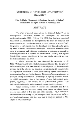 The effect of thermal treatments on the lattice of Zeolite Y and on intracrystalline non-lattice material is investigated by solid-state magic-angle-spinning NMR. (^29)Si and (^27)Al NMR show that large amounts of both silicon and aluminium are dislodged from the lattice by calcination and steaming treatments. Non-lattice material is readily observed by (^29)Si CP/MAS; the presence of such material may also be deduced from the single-pulse spectra by means of spectral deconvolution techniques. Non-lattice aluminium atoms occur in tetrahedral and octahedral coordination; a technique is proposed for measuring the ratio of Al in these two environments. Leaching with aqueous (NH(^4))(_2)EDTA removes non-lattice Al but also attacks lattice Si and may re-insert some Al into the lattice. A reliable technique has been developed for acquisition of (^1)H MAS-NMR spectra of totally dehydrated samples of Zeolite HY. Exceptionally well-resolved signals have been observed for silanol groups and Bronsted-acidic protons. Particular attention has focused on a broad signal at 2.3 ppm attributed to OH groups on non-lattice Al atoms, whose intensity depends on the degree of polymerization of the non-lattice alumina. The degree of polymerization rises on prolonged heating under vacuum. If the sample is kept dry for several months, the AlOH concentration rises at the expense of other hydroxylated species present, suggesting a slow reversal of the polymerization process. The highly-condensed material is also capable of reacting with injected water. Cation-containing Zeolite Y behaves quite differently from HY on dehydration. NaY requires severe heating under vacuum to achieve dryness; however, the product is free from non-lattice material. NH(_4)Y releases its intracrystalline water readily but, on decomposition of NH(^4) at around 300ºC, a new broad signal emerges close to 4 ppm; this is tentatively assigned to NH3 trapped in small lattice cages.