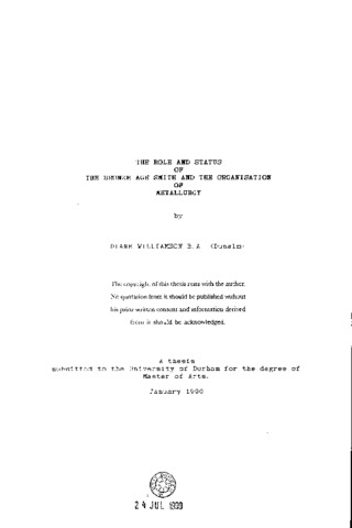 The aim of this study is to explore the role and social standing of the smith in Bronze Age communities and consider the possible forms of organisation of the craft during this period. The approach employed seeks to illuminate the findings of archaeology with the results of anthropological theory and research. It has been to draw on examples of metalworklng in the ethnographic record and, from these descriptions and accounts, including In addition, reference to literary and mythological evidence, to formulate hypotheses about the smith which can be checked against archaeological data. The study Is organised Into an introduction, six chapters and a conclusion. The separate chapters examine; mining and smelting, ore supply, manufacturing technology, the status of the smith, trade and exchange and bronze metalwork. The process of metal production is broken down into its essential technical stages - from ore extraction and smelting through to the fabrication of objects, their trade and exchange and social meaning. Each of these stages Is examined as a social, political and ritual process. The results of this underline the need for and importance of a typology of Bronze Age craftsmen and of the different forms of society of which they were a part.
