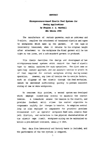 The manufacture of certain garments, such as underwear and T-shirts, requires the attachment of tensioned elastics and tapes to workpieces which make up the garment. If the tape is incorrectly tensioned, when it returns to its original length after attachment to the workpiece the final garment will be too tight or too loose, and a sub-standard garment is produced. This thesis describes the design and development of two microprcessor-based systems which control the feed of elastic tape to sewing machines for such operations. The first uses an open-loop control approach, and can maintain tension to within 2% of that required for correct workpiece sizing during normal operation. However, any loss of tension due to outside factors, such as slippage of the elastic through the feed mechanism, cannot be recovered sufficiently quickly to prevent incorrect sizing of one or more workpieces. To overcome this problem, a second system was developed which employs closed-loop control to maintain the correct tension. A transducer senses the tension in the elastic, and provides feedback which allows the control algorithm to compensate rapidly for changes in tension. An adaptive control loop is also employed to compensate for practical problems encountered such as operator workpiece feed rate, elastic feed path friction, and variations in the physical characteristics of the elastic tape itself. Workpiece sizing can be maintained to within a pre-defined tolerance, usually ± 10mm.Test data from laboratory and factory tests is included, and the performance of the two systems is compared.