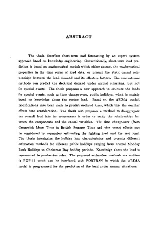 The thesis describes short-term load forecasting by an expert system approach based on knowledge engineering. Conventionally, short-term load prediction is based on mathematical models which either extract the mathematical properties in the time series of load data, or present the static causal relationships between the load demand and its effective factors. The conventional methods can predict the electrical demand under normal situations, but not for special events. The thesis proposes a new approach to estimate the loads for special events, such as time change-overs, public holidays, which is mainly based on knowledge about the system load. Based on the ARIMA model, modifications have been made to predict weekend loads, which take the weather effects into consideration. The thesis also proposes a method to disaggregate the overall load into its components in order to study the relationships between the components and the causal variables. The time change-over (from Greenwich Mean Time to British Summer Time and vice versa) effects can be considered by separately estimating the lighting load and the rest load. The thesis investigates the holiday load characteristics and presents different estimation methods for different public holidays ranging from normal Monday Bank Holidays to Christmas Day holiday periods. Knowledge about the load is represented in production rules. The proposed estimation methods are written in POP-11 which can be interfaced with FORTRAN in which the ARIMA model is programmed for the prediction of the load under normal situations.