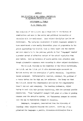 The evolution of the G.G.S.E. was a phase both in the history of examinations and also in the social and political interaction of education with its environment. Each subject discipline has its own development. The turbulent development of modern languages appears to have experienced a more easily discernible phase of progression in the period approaching the G.G.S.E. than at other times over the century and more especially in the post-wax period; in fact 'languages' reached a greater spread of effective contact of the school population than ever before. Such an incidence of events merits .some attention even though alternative sequences were occurring in other subject disciplines. The G.G.S.E. followed in the tradition of the School Certificate, the G.G.E. and the G.S.E. yet it also mirrored major movements in British society and its expectation of public education. Competition became paramount. Differentiation resolved, somewhat, the problems of a common system for the high and low achievers. The irony was that the G.C.S.E. suited the comprehensive schools but the comprehensive schools did not suit everybody. The teaching profession, whilst trying to deal vrith this problem sensitively, felt its national profile deteriorate. These fundamental changes took place at a time of growing concern over the education system. Yet fundamental changes in society were the key to fundamental changes in education. Languages, throughout, democratized down the hierarchy of learning; other subjects followed the pattern. World War II had polarized for languages a pacific, literature-civilization from a message-communication. These became the opposing sides of the battleground, the victory being a merger of the two. This century's main lost soul of the curriculum found its resting-place in G.G.S.E. practicability'. The post-war extension to the whole ability range forced a lonesome mental introversion. Sound experienced psychoanalysis and therapy by the subject association with basic guidance from the examination boards brought restoration to a new state of health. In fact restoratives primarily for the low achiever had been vital. The new government in 1979 encouraged practicality and usefulness of school subjects. Having advised throughout, the subject associations, like others, took the initiative in the teachers' cold war lull, to sound out true opinion (which could not be done publicly due to the intractability of positions) and made recommendation to the government. The contribution of the low achiever was finally acknowledged. The subject associations, uniquely, were in a position to test opinion and act with speed. The disappearance of Ordinary Level and Grammar Schools had proved a strong brake, yet the post World War II period up to the 1980s was inevitably between staging posts of major educational reform and nothing was to stop the G.G.S.E. being by accident or design the frontrunner of a series of reforms. The sources for this study have been the professional literature and reviews underpinned by personal interviews with relevant and representative personnel.
