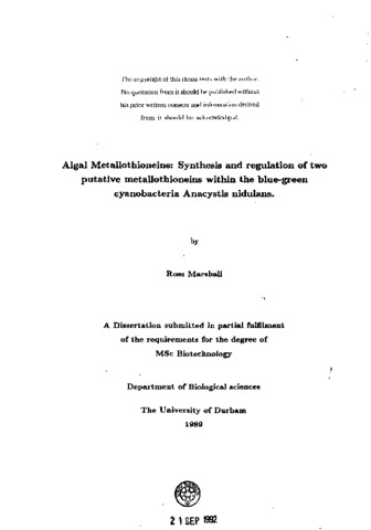 Algal Metallothioneins: Synthesis and regulation of two putative metallothioneins within the blue-green cyanobacteria anacystis nidulans