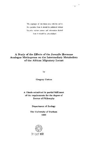A study of the effects of the juvenile hormone analogue methoprene on the intermediary metabolism of the African migratory locust