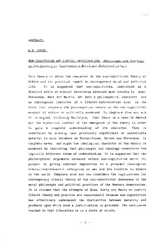 This thesis is about the character of the non-cognitivist theory of ethics and its practical impact on contemporary moral and political life, It is suggested that non-cognitivism, understood as a distinct style of ethical theorising advanced most notably by Ayer, Stevenson, Hare and Mackie, has both a philosophical character, and an ideological character of a liberal-individualist kind. In the first four chapters the philosophical nature of the non-cognitivist account of ethics is critically examined. In chapters five and six it is argued, following Maclntyre, that there is a need to sketch out the historical context of the emergence of the theory in order to gain a complete understanding of its character. This is undertaken by drawing upon previously unpublished or unavailable material by such thinkers as Duncan-Jones, Barnes and Stevenson. In chapters seven and eight the ideological character of the theory is examined by indicating that philosophy and ideology constitute two logically different forms of understanding. It is suggested that the philosophical arguments advanced within non-cognitivism serve the purpose of giving coherent expression to a presumed ideological liberal-individualist conception of man and his relation to others in the world. Chapters nine and ten considers the implications for contemporary liberal theory of the non-cognitivist dominance of the moral philosophy and political practices of the Western democracies. It is claimed that the attempts of Dunn, Forty and Rawls to justify liberal theory and practice are unsuccessful because non-cognim has effectively undermined the distinction between morality and prudence upon which such a justification is grounded. The conclusion reached is that liberalism is in a state of crisis.