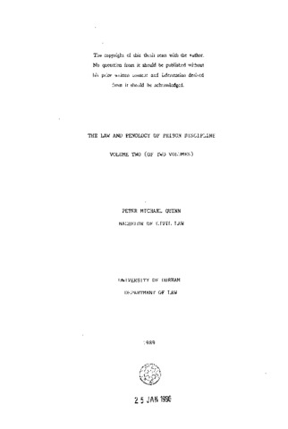 The study is of the disciplinary systems within the prisons of England and Wales. It concerns the response of the courts to prison matters brought before them and examines the effects upon prison life of an increasing demand for adherence to the rules of natural justice. Statutory authorities for the imposition of punishment within prison are reviewed as is the complex interweaving of statute, statutory instrument and internal regulations. There is a comprehensive examination of those parliamentary debates, conferences, committees of inquiry, reports and judgments that have influenced change. Particular reference is made to the question of legal or other assistance for an accused prisoner who faces a disciplinary hearing within the prison. The paper contains an account of the subsystems of discipline said to operate within penal establishments whereby the pressures of institutional life may conspire to prevent a prisoner receiving that to which he or she knows he or she is entitled. The paper draws upon the developing case law, the literature in the field and on private sources. The last of these includes the voice of prisoners themselves who are able to say how, if at all, a growing awareness by staff of the requirements of natural justice has affected the regime under which they live.
