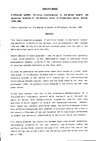 A striking change: political transformation in the Murton miners' and mechanic*' branches of the national union of mineworkera, county Durham, 1978-1988