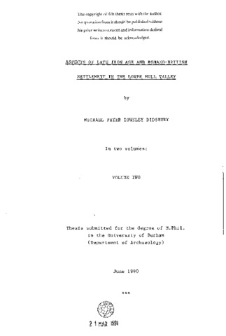 The lower Hull valley is an extensive tract of estuarine alluvium between Kingston upon Hull and Beverley, North Humberside. The thesis examines the evidence for later Iron Age and Romano-British settlement in a landscape block of c. 330 km(^2), incorporating the valley proper and the higher glacial deposits at its margins. The discussion utilises a comprehensive and critical gazetteer of some two hundred and twenty sites and findspots, and seven detailed site-studies present the results of the author’s fieldwork or analysis of previously unpublished material assemblages. The sites are located on both alluvial and glacial deposits, and are presented in the context of their environmental settings. Activity on the valley margins before the end of the Arras burial tradition is evidenced by aerial photography and by the beginning of the first millennium A.D. there were settlements on the clay/alluvium interface at sites such as Salthouse High School, Hull, and Chapel Farm, Weel. Acculturation from south of the Humber is suggested by the use of wheelthrown cordoned pottery at Risby, a site which may have developed into a villa and which remained in occupation until the late fourth century. Settlement on the alluvium deposit itself, hitherto held to have been a tidal inlet of the Humber until the early Middle Ages, can now be demonstrated at riparian sites such as Greylees Avenue, Hull, throughout the Roman period. A substantial body of Roman finds from the alluvium has been revealed by recent fieldwork and database research, and is analysed in the light of the valley’s geomorphology and the lower Mean Sea Level which then obtained and for which a value is postulated.