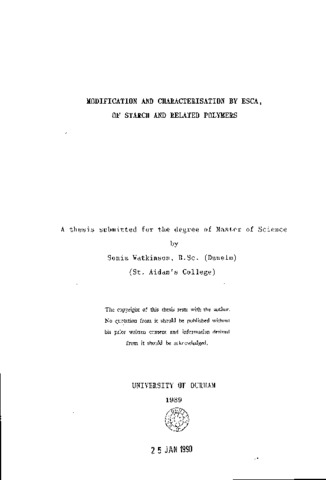 Starch was isolated from soft wheat cultivar (Galahad), by wet fractionation. Electron Spectroscopy for Chemical Analysis (ESCA) was used to examine the surface composition of native and chlorine treated starches, before and after secondary treatments with Pronase enzyme and methanol, which remove respectively, lipid and protein from the starch granule surface. Analysis showed the presence of carbon, oxygen, nitrogen, sulphur and phosphorus in native starch, with a lower C/0 elemental ratio than the theoretical value. This was attributed to the presence of lipid, protein and extraneous hydrocarbon, and confirmed by the analysis of native starch modified by the secondary treatments. Chlorine treatment was found to induce surface oxidation of native starch samples. Covalently bound chlorine was detected which was thought to bind to the lipid and protein residues in preference to the carbohydrate component of starch. Results from chlorinations performed on ovalbumin, cellulose and nylon model polymers supported this postulate. The effects upon native starch and ovalbumin of radio- frequency oxygen plasma, corona discharge and ozonolysis have been examined by ESCA. The oxygen plasma and corona discharge treatments achieved more extensive modifications than chlorine. Ozonolysis produced a similar level of oxidation to that of chlorine treatment, but at a much slower rate. The effects of these novel surface treatments on the performance of starches in cake baking have not been examined.