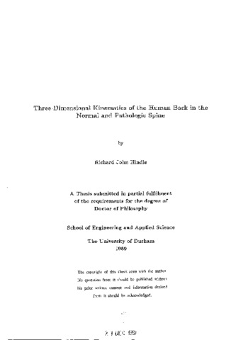 This thesis investigated the relationship between the three-dimensional kinematics of the human back and spinal pathology. This required the development of a system capable of the in vivo measurement of spinal movement non-invasively and in three-dimensions. The opto-electronic CODA-3 Scanner proved unsatisfactory in this respect. The electro-magnetic 3SPACE Isotrak, however, was found to be an accurate and reliable system during a study of twisting in flexed postures. Available axial rotation was significantly increased in some degree of sagittal flexion suggesting that this may be a mechanism for intervertebral disc injury. At high degrees of sagittal flexion a reduction in available axial rotation was noted. In vitro tests on isolated lumbar motion segments confirmed the increase in axial rotation available in flexed postures shown in vivo, this was presumed to be due to an opening of the lumbar zygapophysial joints. Mechanical testing of lumbar interspinous and supraspinous ligaments showed them to be active only in the extremes of sagittal flexion and hence that they could be responsible for the reduction in axial rotation seen in vivo. The 3SPACE Isotrak was used in a clinical study of 80 normal and 43 pathologic subjects. In the normals ranges of motion were, in general, reduced with increasing age in both males and females although a significant increase in sagittal flexion occurred with increasing age in females. Male mobility significantly exceeded female in sagittal flexion but female tended to exceed male in extension, lateral bend and axial rotation. Opposite axial rotation occurred consistently upon lateral bend and vice versa, flexion also occurred on lateral bend but not axial rotation. There was widespread disruption to the primary and coupled movements of the back pain patients when compared to normal movement patterns but there was no clear distinction between the kinematic movement patterns of discrete patient groups. The small numbers in these patient groups warrant a further, more detailed, clinical study.