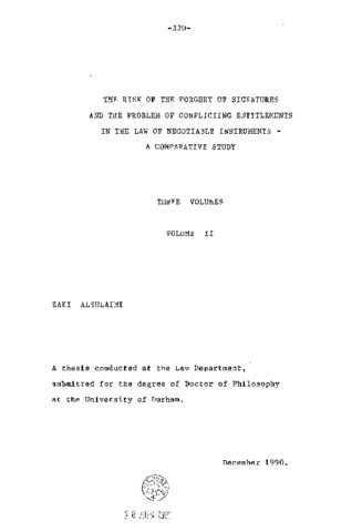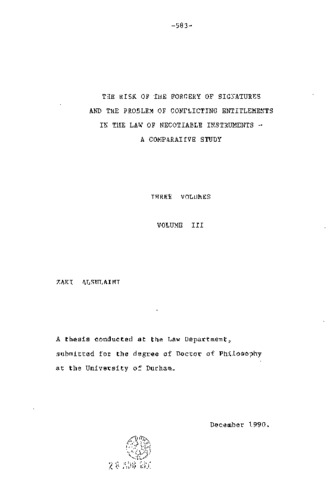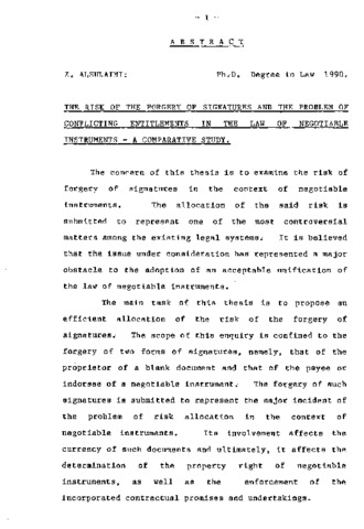 The concern of this thesis is to examine the risk of forgery of signatures In the context of negotiable Instruments. The allocation of the said risk is submitted to represent one of the most controversial matters among the existing legal systems. It is believed that the issue under consideration has represented a major obstacle to the adoption of an acceptable unification of the law of negotiable instruments. The main task of this thesis is to propose an efficient allocation of the risk of the forgery of signatures. The scope of this enquiry is confined to the forgery of two forms of signatures, namely, that of the proprietor of a blank document and that of the payee or indorsee of a negotiable instrument. The forgery of such signatures is submitted to represent the major incident of the problem of risk allocation in the context of negotiable Instruments. Its involvement affects the currency of such documents and ultimately, it affects the determination of the property right of negotiable instruments, as well as the enforcement of the incorporated contractual promises and undertakings. In formulating the proposed allocation of the risk of the forgery of signatures, this thesis takes into account economic considerations, as well as the considerations relevant to the institution of negotiable Instrument So The theory underlying such an attitude is firstly, to reconcile with recent developments in the law, secondly to accommodate the needs of modern society and thirdly, to promote the efficiency of a significant finance instrument. The promotion of the efficiency of negotiable instruments would necessarily promote the efficiency of the market. Finally, this thesis examines the attitude of the major existing legal systems in allocating the forgery of signatures in the context of negotiable instruments. In particular, it examines the attitude of the Anglo-American and the Continental Geneva legal systems. It examines the theories underlying such an attitude. It examines the validity of the advanced theories. It examines the compatibility of the attitude of the said legal systems with the considerations underlying the institution of negotiable Instruments as well as those underlying economic reality. Ultimately, this thesis determines the most compatible legal system with the proposed risk allocation rule.
