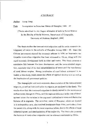 The thesis studies the town-oriented migration and the socio-economic development of towns in the suburbs of Shanghai during 1980 - 87. Since the Chinese government started the economic reforms in 1978, an impressive nationwide rural-urban migration has been witnessed in China, along with the rapid economic development both in cities and towns. The thesis presents a correlative link between the town development and the town-oriented migration, especially which of the fast industrialization of towns and the transference of rural labour surplus. Strong localization of rural labour movement is revealed in this study, which shows the effects of regional development as well as the implication of government policies. The demographic and socio-economic characteristics of the town-oriented migrants, as well as their motivation to migrate, are analysed in the thesis. The results show that the townward migration is closely related to the recent social and economic changes in China, and the regional difference in the rate of development causes the variation in the migrants' motivation to move and distinctive features of in-migrants. The suburban towns of Shanghai, which are located in a metropolitan area, also received in-migrants from cities, particularly from the parent city, along with the rural migration inflow, due to the effects of large industrial sprawl and deurbanization of the major city. The thesis also presents the features of rural-urban migration and its relevant constraints in China.
