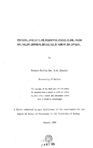 Synthesis reactivity and mechanistic studies on 0X0, alkoxo and tertiary phosphine derivatives of niobium and tantalum