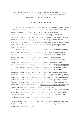 Differing responses in art media to these contemporary issues of London life are explored, taking John Gay's the Beggar's Opera as the focal point for discussion. Initially, a general survey is made of Gay's role as cultural, social and moral critic. Comparison with George Frederick Handel's Floridante allows Gay's work to be placed in the context of operatic responses to contemporary society, highlighting usage both of overt portrayal and indirect satire. Gay's approach to political issues is examined alongside that of Dean Swift's Gulliver's Travels enabling an estimation to be made of the effectiveness of these art media as tools of political propaganda. Similarly, responses in the field of painting are discussed in the light of representative works of James Thornhill and William Hogarth's A Harlot's Progress and A Rake's Progress. In considering all these responses it is noted that art can be interpreted at differing levels, from the sophisticated to the naive. All these art media are then placed in the context of artistic philosophy of the period, thus facilitating an objective assessment of the parallels and differences of art's responses to contemporary issues. Taking into account inherent limitations in the media, to conclude our study, Hogarth's The Beggar's Opera Scenes are compared and contrasted with Gay's prototype. The thesis highlights the trend towards realism in the arts during this period. Nevertheless, we are left with the conundrum that art, 'per se', can only 'mirror' life. It does not necessarily solve its problems. Thesis submitted in fulfilment of the requirements for the degree of Master of Arts in Music. University of Durham Department of Music 1989