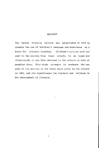 The Durham Printing Service was established in 1978 to promote the use of children's language and experience as a basis for literacy teaching. Children's written work was sent to the service from local schools to be typed and illustrated; it was then returned to the schools in book or pamphlet form. This study attempts to evaluate the use made of the service in the three years prior to its closure in 1986, and its significance for teachers and children in the development of literacy.