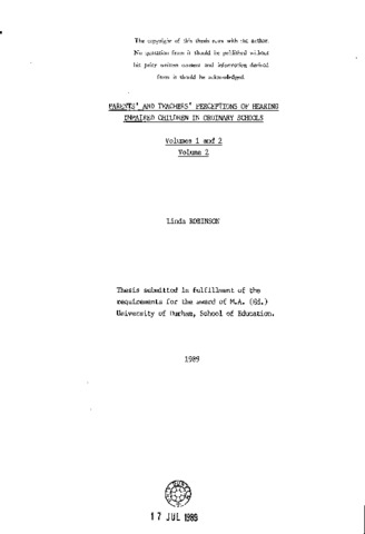 The aim of this study was to consider the perceptions of parents and teachers of hearing impaired children who were integrated into ordinary primary schools. These perceptions, and the responses made to the children, were considered to have significant influence on their ability to function effectively, since the social climate in which a child finds himself affects the development of a positive self-concept and consequent attainment and adjustment. In the research design, quantitative methods were seen as inappropriate, and interview techniques and classroom observations were used to gather illustrative material from a small opportunity sample. The investigation indicates that most of the children were viewed very favourably by their parents and teachers. Parents were very supportive of their child's placement and were aware generally of the implications of hearing impairment. They expressed concern over inadequate technical support, the heavy case-load of the peripatetic service and the lack of awareness of the implications of hearing loss on the part of the general public. Despite the fact that the teachers had neither previous experience nor any training, some were able to respond most appropriately, and this appeared to be due largely to their general philosophy and to the unique value they placed on the social, emotional and educational development of the individual child.