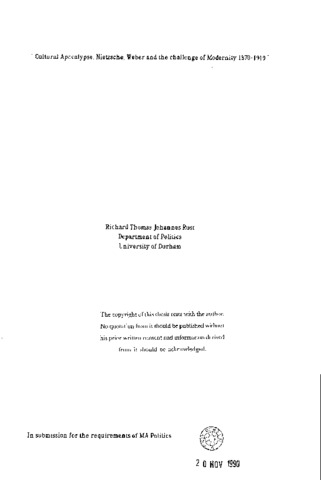 Cultural apocalypse: Nietzsche, Weber and the challenge of modernity 1870-1919