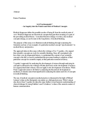 Medical diagnoses define the possible modes of being ill from the medical point of view. Medical diagnoses are theoretical concepts that gain their meaning as a part of the prevailing medical theory. As medical theories change over time, also medical concepts change, as can be seen in the long history of medical thinking. The purpose of this essay is to illustrate medical thinking through examining the formation and use of one example of a particular medical concept “psychosomatic” in medical theory and practice. The approach taken in this essay reflects the writings of Lev Vygotsky, who argued that scientific concepts are tools for scientific thinking. Since all conceptual tools have their own developmental history, to understand the content of any scientific concept to the full we need to understand the processes leading to adoption of that particular concept for scientific inquiry at that particular moment in history. Vygotsky’s approach for analysing the development of science through analysing its concepts is reflected to the writings of Kuhn and Fleck on the development of science. It is argued, that Kuhn’s theory does not apply to the development of medicine. While Fleck’s approach seems to fit better to analysing the theoretical development in medicine, it remains somewhat superficial in analysing the nature and role of concepts in medical thinking. The use of medical concepts in medical practice is discussed in the light of Mikael Leiman’s ideas on the therapeutic encounter as a dialogical process. While Leiman also draws from Vygotsky he takes the issue further toward semiotic understanding of clinical dialogue by using Bakhtin’s and Voloshinov’s ideas of the semiotic nature of human communication.