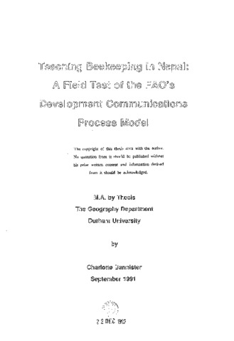 This thesis explores the problem of integrating women into rural development programmes. Specifically, it examines the potential of Development Communications as a strategy for achieving sustainable development, with particular reference to the author’s beekeeping project for women in Nepal. The thesis also addresses typical failures in development programmes relating to women and gender issues. Women are effectively excluded from the majority of development programmes because of their low social and economic status. However, they do make up half the adult population, and can play a vital role in family and community development. It is therefore crucial to ensure their participation in the development process. Indeed, the thesis argues that this is the key to achieving sustainable development. Therefore, strategies are considered for involving and empowering women in development programmes - this is done principally through income-generating activities - and one activity in particular, modern beekeeping, is identified as being most appropriate for rural women living in the Sindhupalchowk district of Nepal. Development Communications is hence seen as the essential means for motivating and enabling such a target audience to adopt these new activities. The theoretical and practical issues involved in Development Communications are then surveyed in a number of projects from Nepal and other parts of Asia. The author describes her own case study, called "Communications for the Future", in which the FAO's Development Communications Process Model is evaluated and specific improvements are recommended. Solar power is used to run the communications equipment in the field, and this is identified as the most appropriate means of activating video-training systems in remote rural areas. However, successful Development Communications depends not only on technology but also on interpersonal communication and on an interactive approach. The thesis suggests that potential problems, such as differences of language or culture, can be overcome by taking a bottom-up rather than top-down approach, involving the target audiences in all stages of the communications process and producing educational material which is culturally specific. Finally, the thesis demonstrates the practical value of its approach to Development Support Communications. It shows that involving women in income-generating activities can have positive effects for the local economy, for the status of women and for integrated rural development.