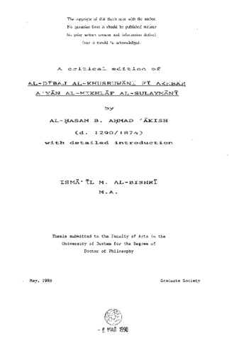 This dissertation consists of a detailed study and critical edition of the invaluable historical work, al-Dībāj al-khusruwāni fī akhbār a'vān al-Mikhlāf al-Sulaymānī The first part of this study comprises an English introduction, in seven chapters, which attempts to paint a full picture of both the work and the historical period concerned. The author and his work are dealt with in the first chapter. This includes the first full biography of the author, a description of his other works, a review of the manuscripts used in the edition and an explanation of the editorial method. In chapter two the rule of the Āl Khayrāt family in al-Mikhlāf al-Sulaymāni and the arrival of Ibn 'Abd al-Wahhāb's movement in the area are discussed in order to provide full historical background. Chapter three is concentrated on a summary of the Dībāj, made to assist the English reader in his understanding of the subject as a whole. Chapter four is given over to a discussion on 'Ākish's style and language. It also contains a glossary of some unusual words. Comments and notes on the text, plus Qur'ānic and Hadīth references and an analysis of the poetic metres used by the author, make up chapter five. Chapter six comprises an index of the geographical places and tribal names mentioned in the text, while Chapter seven deals with biographies.The study closes with a bibliography, two maps and a family-tree of the Al Khayrāt dynasty. The edited Arabic text comprises the second part of this study and is followed by a chapter on the Hadīth quoted and by three appendices, containing the author's references and biographical indexes to the author's Hadā'iq al-Zahr and 'Uqūd al-durar manuscripts.