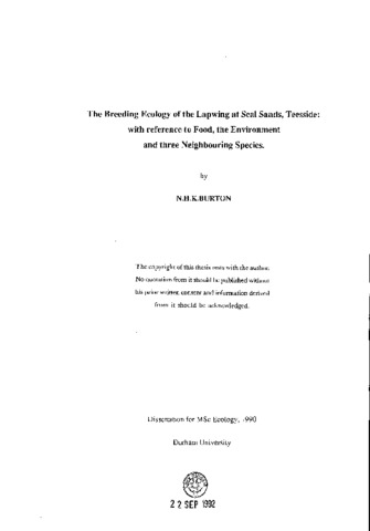The Breeding Ecology of the Lapwing at Seal Sands, Teesside:: with reference to Food, the Environment and three Neighbouring Species.
