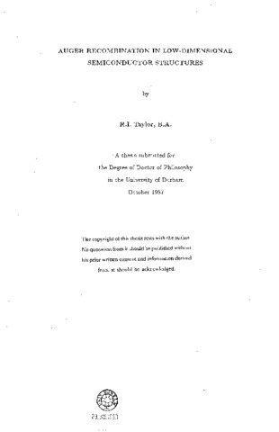 In this thesis, calculations of Auger recombination rates in semiconductor quantum wells are presented. Chapter One introduces Auger recombination, and the reasons for studying the Auger process are explained. Basically, Auger recombination is a non- radiative recombination mechanism that becomes more important as the carrier density increases and the bandgap decreases. In direct gap semiconductors, the Auger process has an activation energy, and the resulting highly temperature dependent Auger process is thought to be a possible cause of the high temperature sensitivity of long wavelength semiconductor lasers that are being considered for use as sources in optical fibre communications systems. In Chapter Two, an expression is derived for the CHSH Auger recombination rate in a quantum well (QW) heterostructure. The possible Auger processes in a QW are discussed as are the differences between Auger recombination in a QW and in bulk semiconductors, and the magnitudes of QW and bulk Auger rates are compared. In Chapter Three, the theory of Auger recombination is extended to the case of a quantum well wire (QWW), a semiconductor structure in which carriers are free to move in one direction only. It is found that there are no significant physical differences between Auger recombination in a QW and in a QWW. The ratio of QW and QWW Auger rates is evaluated. Numerical results for Auger transition rates in 1.3µm and 1.55µm In- GaAsP/InP QWs and QWWs are presented in Chapter Four, and comparison with experimental values is made. In particular, the result found in Chapter Two, that, under certain conditions, the Auger rates in the QW and the bulk are approximately the same is found to agree with experimental results from the literature. The derivation of the CHSH Auger transition rates in QWs and QWWs that was presented in Chapters Two and Three required a number of approximations concerning the carrier statistics and the semiconductor bandstructure. In Chapter Five, these approximations are examined, and, although it is found that the use of non-degenerate carrier statistics is reasonably accurate, the assumption of parabolic energy bands can lead to overestimates of .the Auger transition rates. The first five chapters constitute the first part of the thesis, concerning Auger recombination in low-dimensional semiconductor structures. In the second part of the thesis, the realistic bandstructure of low-dimensional semi conductor structures, such as superlattices, is examined. The method used is described in Chapter Six, and is based on an empirical pseudopotential method. Results for the GaAs/AlAs superlattice are presented in Chapter Seven.