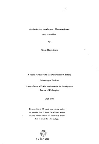 Chemotaxis in Agrobacierium tumefaciens was studied. Several plant derived monocyclic phenolic compounds were analysed for their ability to act as chemoattractants for A. tumefaciens C58C (^1) and as inducers of the Ti-plasmid virulence operons. The results divided the phenolics into 4 groups. A strong correlation between vir- inducing ability and Ti-plasmid requirement for chemo taxis was established and chemical structure rules for vir induction and chemo taxis are outlined. Furthermore, virA and virG were found to be the Ti-plasmid virulence genes required for chemo taxis towards the monocyclic phenolic compound acetosyringone. Chemotaxis towards both monocotyledonous and dicotyledonous plant extracts was analysed. Undiluted shoot and root extracts from both sources elicited a response from both Ti-plasmid harbouring and cured A. tumefaciens C58C(^1) However, when diluted extracts of Wheat and Kalanchoe shoot homogenate were analysed, a distinct enhancement of chemotaxis was conferred by the Ti-plasmid, suggesting that recognition of, and attraction towards, susceptible plants is not the step blocked in monocot transformation. Analysis of cell wall material revealed that native cell wall components are not required for chemotaxis of A. tumefaciens C58C (^1) towards plant extracts. Results obtained on chemotaxis along with current knowledge of vir- induction allowed the development of a novel idea involving Agrobacterium as a biocontrol agent. A chitinase gene from Serratia marcescens was manipulated such that its promotor was removed. The promotorless cassette was linked to the virB pro-motor from an octopine Ti-plasmid and the construct introduced into Agrobacterium harbouring virA and virG. The potential benefit of this biocontrol system with respect to other existing biocontrol systems is that expression of the pesticidal gene is regulated by components of wound exudate and therefore is a conservative process, pesticide being produced only when a plant is wounded, at a time when it is most susceptible to attack by plant pathogens, and then exclusively in the microrhizosphere around the wound site.