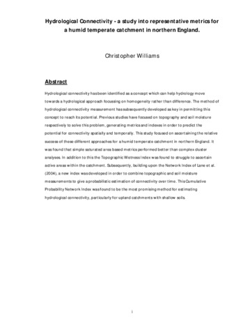 Hydrological Connectivity - a study into representative metrics for a humid temperate catchment in northern England.