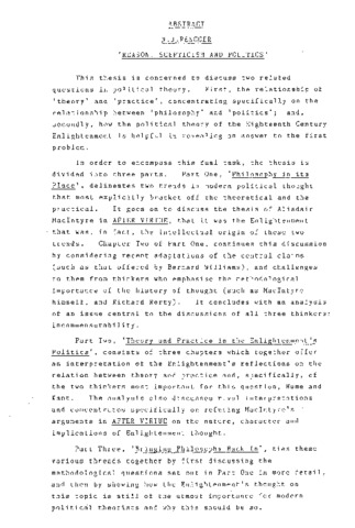 This thesis is concerned to discuss two related questions in political theory. First, the relationship of 'theory' and 'practice', concentrating specifically on the relationship between 'philosophy' and 'polities'; and, secondly, how the political theory of the Eighteenth Century Enlightenment is helpful in revealing an answer to the first problem. In order to encompass this dual task, the thesis is divided into three parts. Part One, 'Philosophy in its Place', delineates two trends in modern political thought that most explicitly bracket off the theoretical and the practical. It goes on to discuss the thesis of Alisdair Maclntyre in AFTER VIRTUE, that it was the Enlightenment that was, in fact, the intellectual origin of these two trends. Chapter Two of Part One, continues this discussion by considering recent adaptations of the central claims (such as that offered by Bernard Williams), and challenges to them from thinkers who emphasise the methodological importance of the history of thought (such as Maclntyre himself, and Richard Rorty). It concludes with an analysis of an issue central to the discussions of all three thinkers: incommensurability. Part Two, 'Theory and Practice in the Enlightenment’s Politics ', consists of three chapters which together offer an interpretation of the Enlightenment's reflections on the relation between theory and practice and, specifically, of the two thinkers most important for this question, Hume and Kant. The analysis also discusses rival interpretations and concentrates specifically on refuting Maclntyre's arguments in AFTER VIRTUE on the nature, character and implications of Enlightenment thought. Part Three, 'Bringing Philosophy Back In', ties these various threads together by first discussing the methodological questions set out in Part One in more detail, and then by showing how the Enlightenment's thought on this topic is still of the utmost importance for modern political theorists and why this should be so.