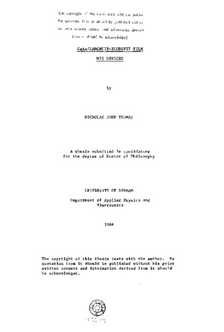 Langmuir-Blodgett (LB) films have previously been used as organic insulating layers in compound semiconductor metal-insulator- semiconductor devices, with promising preliminary results. This thesis describes the first investigation of the use of LB films In gallium arsenide metal-insulator-semiconductor devices. Diodes incorporating thin layers of w-tricosenoic acid or substituted copper phthalocyanine possessed 'leaky' electrical characteristics, I.e. there is some conduction through the LB film. This 'leaky' behaviour was exploited to produce the first metal- Insulator-semiconductor-switch (MISS) incorporating an LB film. MISS devices on n-p(^+) GaAs were produced with good switching characteristics and a high yield (~90%), using LB film thicknesses between 9 and 33 nm. It was shown that the 'punch through' mechanism was responsible for the switching behaviour. p-n(^+) GaAs/LB film MISS diodes behaved rather differently, with good switching characteristics only found at reduced temperature. Some degradation of the characteristics of LB film MISS devices was noted, although this was reduced by using the more robust phthalocyanlne LB films. Metal-tunnel-insulator-semiconductor diodes were produced on the ternary alloy Ga(_.47)In(_.53)As, using LB film monolayers. The barrier height was apparently larger than that of Schottky barriers on this material, with a very substantial reduction in current density due to tunnelling through the LB film. Using this technique it may be possible to produce very high performance GaInAs fleld-effect-transistors, which are analogous to GaAs metal-semiconductor field effect transistors.