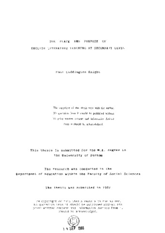 It is the aim of this thesis to trace the path of English Literature’s developing and changing place and purpose within the aim of the development of a liberal education. It will do so from the nineteenth century's time of socio-economic change, through the reassessments and confirmations of the importance of Literature’s place described by writers following the social and political upheavals caused by the Great War, through to an analysis of the contemporary situation, and to a consideration of likely future developments. The study is concerned with the placing of contemporary and possible future proposals for the teaching of English Literature in the historical context of past provision and beliefs concerning Literature's purpose, and the first part of the thesis will show how and why Literature came to have a major role in a liberal education's provision assigned to it, and how that role evolved over the ensuing decades. The second part will consider how contemporary national pressures have brought about a reassessment of Literature’s place and purpose, caused by demands for change. The agents of that change will be examined and the thesis will indicate where the traditional role of English Literature teaching stands in relation to some of the changes in educational emphasis being introduced. Finally the study will examine the implications such nationally designed initiatives and changes may have upon the provision and teaching of Literature in secondary schools in County Durham. Through survey, it will investigate how English departments are responding, bearing in mind their views on Literature's place and purpose in their teaching. It will appear from surveys and interviews that responses are complex and that actual and predicted changes may differ markedly from those expected.