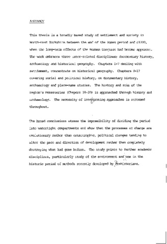 This thesis is a broadly based study of settlement and society in North-East Yorkshire between the end of the Roman period and cl200, when the long-term effects of the Norman Conquest had became apparent. The work embraces three inter-related disciplines; documentary history, archaeology and historical geography. Chapters 1-7 dealing with settlement, concentrate on historical geography. Chapters 8-17 covering social and political history, on documentary history, archaeology and place-name studies. The history and role of the region’s monasteries (Chapers 18-20) is approached through history and archaeology. The necessity of integrating approaches is stressed throughout. The broad conclusions stress the impossibility of dividing the period into watertight compartments and show that the processes of change are evolutionary rather than catastrophic, political changes tending to alter the pace and direction of development rather than completely destroying which had gone before. The study points to further academic disciplines, particularly study of the environment and 'use in then 'historic period of methods recently developed by Prehistorians.