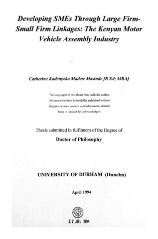 This thesis aims to explore the prospects for small and medium enterprise (SME) development using inter-finn linkages between large and small finns in Kenya A wide range of strategies has been adopted already for the development of small enterprises globally, but limited use appears to have been made, outside Japan, of inter-finn linkages as a specific strategy. Despite the recent global movement towards inter-finn relationships as a strategy for achieving efficiency through the down-sizing of large finns, externalisation of activities, and adoption of lean production techniques, no attempt appears to have been made to use the strategy for SME development, possibly because little is known about how inter-finn linkages between large and small .finns are fonned. This thesis aims to con1ribute to the development of this understanding by using an inductive, qualitative research approach to explore the fuctors influencing the sourcing strategies of large finns in Kenya, to detennine whether these have some potential for SME development both in the country and more generally. The study focuses on the Kenyan vehicle assembly industry and examines, through in-depth case studies, the sourcing activities of three vehicle assembly plants and four franchise holders. Overnll, the research lends support to the argument that for various reasons largely related to m.arlcet failure, and a non-conducive business environment, large firms in Kenya's motor vehicle industIy are reluctant to outsource voluntarily from local small finns, and that when they do, relations appear to be arms-length and adversarial. The research also reveals that in the Kenyan environment, contrary to the arguments of transaction cost theory, outsourcing decisions are predicated on the need to comply with compulsory regulations in order to gain access to resources and m.arlcets, rather -than primarily on cost minimisation. Consequently, strategies which assure access to resources such as foreign exchange and impo.rt licenses were found to override purely efficiency considerations. The findings imply that although there are some prospects for SME development using this approach, the selection of small enterprises as suppliers by managers of large firms is limited by large firms' perceptions of the suitability of such suppliers, and that if SME development is to take place through such linkages, strategies which either change the image of small suppliers, or improve the attitudes oflarge buyers have to be adopted.