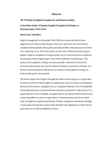 The Problem of English Evangelicals and Homosexuality: A Girardian Study of Popular English Evangelical Writings on Homosexuality 1960-2010