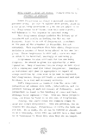 Human forgiveness is always a personal response to personal wrong. In this it differs from pardon, which is a social activity undertaken only by one qualified to do so. Forgiveness is different from both understanding and tolerance in its response to personal wrong. True forgiveness always includes the letting go of resentment and results in healing for the one who forgives. Prior to an act of forgiveness, repentance on the part of the wrongdoer is desirable, but not essential. When repentance does take place, forgiveness includes a measure of trust being placed in the one forgiven. Since forgiveness is difficult, there are ways in which it is falsified, knowingly or unknowingly. Forgiveness is also difficult for the one being forgiven. He should be given the opportunity to make reparation. Many situations involve wrongs on both sides with a consequent need for mutual forgiveness. Sometimes an individual will feel it appropriate to repent of wrongs committed by those whom he is seen to represent. Self-forgiveness, though difficult to understand and open to abuse, is a real and necessary activity. God’s forgiveness is examined from the three-fold perspective of release from debt, justification, and the personal bearing of hurt and renewal of fellowship. Each perspective is found in the teaching of Jesus and Paul, although their emphases differ. From all three perspectives, the Gross is found to be the cost of forgiveness. Finally, the thesis notes the elements common to human and divine forgiveness. Both are personal, and so involve the feelings. Forgiveness is costly for both man and God. It is risky, for it can be refused or abused. It is a necessity, since both man and God have a deep need to be reconciled to those from whom they are estranged.