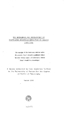 The thesis attempts to explain the emergence of maintained secondary education in Ealing by 1913 and to describe the subsequent development of the maintained secondary schools up to 1944. These developments are set within the context of the community which formed the borough and of the county of Middlesex. They are related to contemporary educational ideas and practices. Contributory demographic, social and political influences on the development of maintained secondary education in Ealing are identified and an assessment of the roles of influential personalities is undertaken. Some appraisal of the success or otherwise of Middlesex and Ealing policy and of the place of this policy within the national framework is offered. An effort has been made to portray adequately the educational experiences of boys and girls at the Ealing County Secondary Schools in the period 1913-1944.The possibility of a thesis first arose with the acquisition of notebooks and documents belonging to the late Mr. E.P.H. Pugh. These were kindly lent by Mrs. Pugh. The notebooks contain copies of documents relating to many aspects of Ealing's history including some relevant to education. The documents in the collection include some annual reports of the Ealing Educational Association and the Ealing Education Committee together with letters and papers concerned with discussions prior to the implementation of the 1944 Education Act in the borough. As such the collection has been a useful springboard from which to launch a study of secondary education in Ealing between 1902 and 1944.other local primary sources consulted are to be found in the Ealing Reference Library and the Greater London Records Office and History Library. They include newspapers, the minutes of various education, borough and county committees, head teachers’ reports, the reports of H,M. school inspectors and the texts of various addresses and lectures given during the period by the personalities involved. National primary sources consulted are to be found in the Public Records Office. Attempts were made to contact former pupils and teachers who worked in the Ealing County Schools between 1913 and 194.4,. Those who contributed are listed in the bibliography.