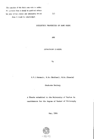 The main part of this thesis describes dielectric studies on a series of oxynitride glasses prepared at Wolfson Centre for High Strength Materials, University of Newcastle upon Tyne. Bridge techniques were used to determine the room temperature values of permittivity (ε') and dielectric loss (ε") for some Y-Al-Si and Nd-Al-Si oxynitride glasses and for further compositions in the Mg-Al-Sl and Ca-Al-Si systems. Over the range 500 Hz to 10 KHz the frequency dependencies of ε' and conductivity (σ) were found to be in good agreement with the Universal law of dielectric response i.e. (ε'- ε (_∞)) oc ω((^n-1) and σ (ω) oc ω(^n) giving n = 1.0 ± 0.1 for all compositions examined. In all four systems the addition of nitrogen increased the permittivity while, at each concentration of nitrogen (including the oxide glasses) the permittivity increased with cation type in the order magnesium, yttrium, calcium, neodymlum. As regards the higher frequency regime coaxial line techniques were used to determine, at room temperature, both ε' and ε" for some Mg-Al-Si, Ca-Al-Si and Y-Al-Si oxynitride glasses over the frequency range 500 MHz to 5 GHz. Here the frequency dependencies of ε' and ε" are also consistent with the Universal Law of dielectric response in that (ε'- ε(_∞)) oc ω((^n-1)) and ε" oc ω((^n-1)) for all glass compositions. The high experimental value of the exponent (n = 1.0 ± 0.1) suggested the limiting form of lattice loss situation. In this frequency range (as also at the lower frequencies) the addition of nitrogen increased the permittivity and it was confirmed that in both the oxide and oxynitride glasses ε' is influenced by the cation, being increased with cation type in the order magnesium, yttrium, calcium as at lower frequencies. At still higher frequencies, in the microwave region, special cavity perturbation methods of measurement were developed and used. Preliminary studies are also reported on the temperature dependencies of ε' and ε" for a similar range of glass compositions and on the optical behaviour of the oxynitride glasses both in the visible and infra-red regions of the spectrum. In the Appendices summaries are given of published papers on oxynitride glasses (Appendix I) and also on single crystal MgO, Fe/MgO, Cr/MgO and Co/MgO (Appendix II) a study which formed an addendum to the main work.