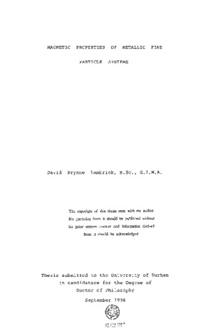 A study of the magnetic properties of metallic fine particle systems in the form of magnetic fluids has been made. The fluids were prepared utilising the organometallic decomposition route (detailed separately by N. Mason, Ph.D. thesis, Durham University 1986) and single metal systems containing Fe, Co and Ni were prepared from new precursors. The properties of the first hydrocarbon based mixed metal particle systems are also reported. For systems prepared with Fe precursors it is thought that the fine particles are not in the α-Fe phase but may be amorphous and/or consist of iron carbides. Co and Ni systems result in particles with bulk-metal like structures although Co usually forms in the f.c.c. phase. The h.c.p. is also observed. The mixed metal systems were of FeCo and Ni(_3)Fe and a tendency to form the superlattice or ordered structures was observed. In both cases Fe has been lost to the particles and this is thought to be due to the formation of volatile iron compounds during preparation and/or surfactant complexes. Narrow size distributions have been obtained in all cases with mean particle diameters in the range 4-10 nm and standard deviations of between 0.8 and 1.9. The form of the size distribution has been found to be Gaussian. A study of the anisotropy of the particles using torque and magnetisation measurements has found uniaxial anisotropy with the first anisotropy constant of the order lO(^5)Jmֿ(^3).The values observed are too large to be ascribed solely to shape anisotropy. Low temperature magnetisation measurements have revealed the existence of a paramagnetic component in the fluids. Loss of magnetisation has occurred in all systems and is thought to be due to oxidation of the metal.