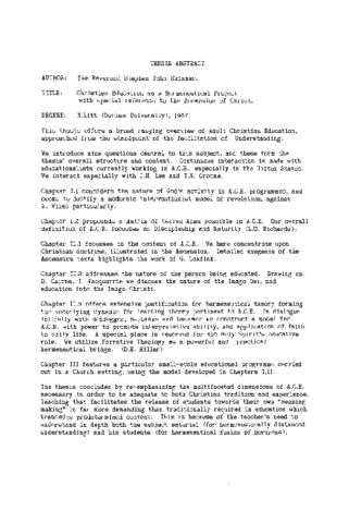 This thesis offers a broad ranging overview of Adult Christian Education, approached from the standpoint of the facilitation of Understanding. We introduce nine questions central to this subject, and these form the thesis' overall structure and content. Continuous interaction is made with educationalists currently working in A.C.E., especially in the United States. We interact especially with J.M. Lee and T.H. Groome. Chapter I.l considers the nature of God's activity in A.C.E. programmes; and seeks to justify a moderate interventionist model of revelation; against M. Wiles particularly. Chapter I.2 propounds a matrix of twelve Aims possible in A.C.E. Our overall definition of A.C.E. focuses on Discipleship and Maturity (L.O. Richards).Chapter II.1 focuses on the content of A.C.E. We here concentrate upon Christian doctrine, illustrated in the Ascension. Detailed exegesis of the Ascension texts highlights the work of G. Lohfink. Chapter II.2 addresses the nature of the person being educated. Drawing on D. Cairns, J. Macquarrie we discuss the nature of the Imago Dei, and education into the Imago Christi. Chapter II.3 offers extensive justification for hermeneutical theory forming the underlying dynamic for learning theory pertinent to A.C.E. In dialogue initially with Heidegger, Bultmann and Gadamer we construct a model for A.C.E. with power to promote interpretative ability, and application of faith to daily life. A special place is reserved for the Holy Spirit's educative role. We utilize Narrative Theology as a powerful and practical hermeneutical bridge. (D.E. Miller)Chapter III features a particular small-scale educational programme carried out in a Church setting, using the model developed in Chapters I.II. The thesis concludes by re-emphasizing the multifaceted dimensions of A.C.E. necessary in order to be adequate to both Christian tradition and experience. Teaching that facilitates the release of students towards their own "meaning making" is far more demanding than traditionally required in education which transmits predetermined content. This is because of the teacher's need to understand in depth both the subject material (for hermeneutically distanced understanding) and his students (for hermeneutical fusion of horizons).