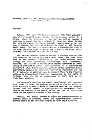Between 1964 and 1974 Margaret Laurence (1926-1987) produced a body of fiction which established her as a major woman writer in a Canada where the emergence of post-war nationalism created a readiness to accept, buy and read books by Canadians about Canada. For this she created the town of Manawaka - partly based on her home town of Neepawa, Manitoba - which became the symbol of all Canadian small towns. The thesis is an examination in chronological order of her work: The stone angel, A jest of god, A Bird in the House (short stories).The Fire-Dwellers and the Diviners. Her writing deserves attention because it portrays Canadian life with integrity. As fiction by a woman about women, her work shows none of the romantic fantasising of the lesser novelist. Happy endings are never guaranteed; relationships have unharmonious elements. She reveals a society which imposes restraints on women, making it difficult to achieve self-fulfilment in a male-oriented environment where traditional role patterns stifle legitimate female aspirations. However, her novels are feminist by implication and not in an obtrusive or polemical way. An emergent theme is the injustice suffered by disadvantaged minorities represented by the metis of Manitoba whom she saw as dispossessed of their land by the Anglo-Saxon settlers. Mrs Laurence's technique was always experimental and developed from novel to novel. She employed variations of time and voice: the inner monologue is used to evoke an immediate response, the movement between past and present to highlight mood and temperament. These devices are examined in the thesis, as are her use of distinctive idiom and the symbolic elements of her writing. Finally, her honest attempt to depict the extraordinariness of ordinary people in carefully worked and sympathetically conceived stories speaks to the universal longing to learn about ourselves.