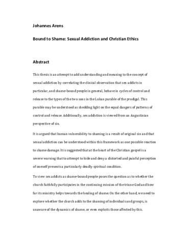 This thesis is an attempt to add understanding and meaning to the concept of sexual addiction by correlating the clinical observation that sex addicts in particular, and shame-bound people in general, behave in cycles of control and release to the types of the two sons in the Lukan parable of the prodigal. This parable may be understood as shedding light on the equal dangers of patterns of control and release. Additionally, sex addiction is viewed from an Augustinian perspective of sin. It is argued that human vulnerability to shaming is a result of original sin and that sexual addiction can be understood within this framework as one possible reaction to shame damage. It is suggested that at the heart of the Christian gospel is a severe warning that to attempt to hide and deny a distorted and painful perception of oneself presents a particularly deadly spiritual condition. To view sex addicts as shame-bound people poses the question as to whether the church faithfully participates in the continuing mission of the triune God and how far its ministry helps towards the healing of shame. On the other hand, we need to explore whether the church adds to the shaming of individuals and groups, is unaware of the dynamics of shame, or even exploits those affected by this. In the context of the current discourse within the Christian church about human sexuality, and in view of recent scandals of sexual abuse, the question of ministry towards those whose sexuality is wounded is of particular concern.