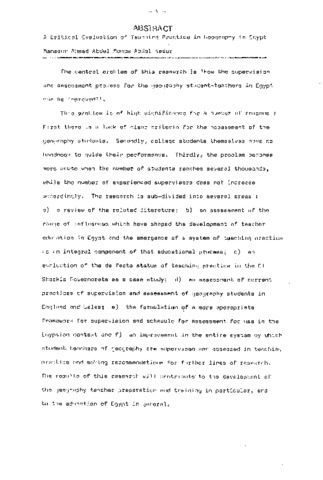 The central problem of this research is 'How the supervision and assessment process for the geography student-teachers in Egypt can he improved?’. This problem is of high significance for a number of reasons : First there is a lack of clear criteria for the assessment of the geography students. Secondly, college students themselves have no handbook to guide their performance. Thirdly, the problem becomes more acute when the number of students reaches several thousands, while the number of experienced supervisors does not increase accordingly. The research is sub-divided into several areas : a) a review of the related literature; b) an assessment of the range of influences which have shaped the development of teacher education in Egypt and the emergence of a system of teaching practice as an integral component of that educational process; c) an evaluation of the de facto status of teaching practice in the El Sharkia Governorate as a case study; d) an assessment of current practices of supervision and assessment of geography students in England and Wales; e) the formulation of a more appropriate framework for supervision and schedule for assessment for use in the Egyptian context and f) an improvement in the entire system by which student-teachers of geography are supervised and assessed in teaching, practice and making recommendations for further lines of research. The results of this research will contribute to the development of the geography teacher preparation and training in particular and to the education of Egypt in general.