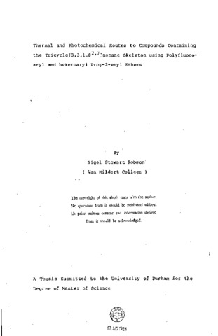 This work is concerned with the sythesis of fluorine containing derivatives of the novel tricyclo[3.3.1.0(^2,7)]nonane skeleton by both thermal and photochemical routes from Claisen rearrangement products obtained from polyfluoroaryl and heteroaryl prop-2-enyl ethers. Fluorine is used as a blocking group to prevent an intermediate dienone from rearranging to a tautomeric phenol. Thermal rearrangements of 2,3,5,6-tetrafluoro-4-pyridyl prop-2-enyl ether 41 in the vapour phase gives (via an intramolecular Diels-Alder addition reaction of the intermediate dienone) 2,4,5,7-tetrafluoro-3-aza-tricyclo[3.3.1.0(^2,7)]non-3-en-6-one 42. The structure of this product was confirmed by complete hydrolysis with 50% sulphuric acid to give 4-hydroxybenzoic acid. Hydrolysis and hydration of the Diels-Alder adduct with water gave 2,5,7-trifluoro-6,6-dihydroxy-3-aza-tricyclo [3.3.1.0(^2,7)]nonan-4-one 43. This compound was readily dehydrated by sublimation under high vacuum to give 2,5,7-trifluoro-3-aza-tricyclo[3.3.1.0(^2,7)]nonan-4,6-dione 44. l,3,5,6,7,8-Heptafluoro-2-naphthyl prop-2-enyl ether 77 readily underwent Claisen rearrangement in xylene at reflux to give l,3,4,5,6,7,8-heptafluoro-l-(prop-2-enyl)-napnthalen-2-one 80. Irradition of the napnthalenone in solution at 366nm gave rise to two isomeric tricyclic compounds 2,5,7-trif luoro-3,4-(tetrafluorobenzo) -tricyclo[3.3.1.0(^2,7)]non-3-en-6-one 95 and l,2,7-trifluoro-3,4-(tetrafluorobenzo)-tricyclo[3.3.1.0(^2,7)]non-3-en-6-one 103. Compound 103 is formed by an initial [3,5] sigmatropic shift, followed by a [2+2] cycloaddition and then a [1,3] sigmatropic shift. This compound was easily hydrated to give the corresponding gem-diol l,2,7-trifluoro-3,4-(tetrafluorobenzo)-tricyclo[3.3.1.0(^2,7)]non-3-en-8,8-diol 104 The structure of the second compound 95, formed by a direct [2+2] cycloaddition reaction was shown by hydrolysis and methylation to give 1β,4β,5,6,7,8,8bβ - heptafluoro-1α-methoxycarbonyl-8b,2a,3,4-tetrahydro-8bα,2aα-ethanonaphthalene 96c which was identified by (^19)F nmr and i.r. spectroscopy. Pyrolysis of compound 95 at 450ºC gave the naphthalenone 80 whilst at higher temperatures (490ºC) a new compound 1-fluorovinyl-4,5,6,7,8-pentafluoro-1-naphthyl ketone105 was formed. Pyrolysis of 1,3,4,5,6,7,8-heptafluoro-1- (prop-2-enyl)-naphthalen-2-one 80 at 455ºC gave the the compound 55 in very low yield. At higher temperatures (490ºC) the 1-fluorovinyl ketone 105 was formed.