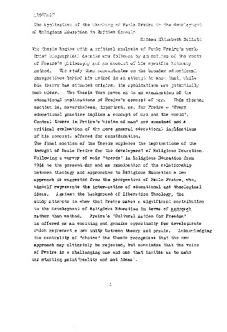 The thesis begins with a critical analysis of Paulo Freire's work. Brief biographical details are followed by an outline of the roots of Freire's philosophy and an account of his specific literacy method. The study then concentrates on the broader educational perspectives behind his method in an attempt to show that, while his theory has situated origins, its applications are potentially much wider. The Thesis then moves on to an examination of the educational implications of Freire's concept of man. This shorter section is, nevertheless, important, as, for Freire - 'every educational practice implies a concept of men and the world’. Central themes in Freire's ‘vision of man’ are examined and a critical evaluation of the more general educational implications of his concept, offered for consideration. The final section of the Thesis explores the implications of the thought of Paulo Freire for the development of Religious Education. Following a survey of main 'trends' in Religious Education from 1944 to the present day and an examination of the relationship between theology and approaches to Religious Education a new approach is suggested from the perspective of Paulo Freire, who, himself represents the inter-action of educational and theological ideas. Against the background of liberation Theology, the study attempts to show that Freire makes a significant contribution to the development of Religious Education in terms of approach rather than method. Freire's 'Cultural Action for Freedom' is offered as an exciting and genuine opportunity for developments which represent a new unity between theory and praxis. Acknowledging the centrality of 'choice' the Thesis recognises that the new approach may ultimately be rejected, but concludes that the voice of Freire is a challenging one and one that invites us to make our starting point ‘reality and not ideas’.