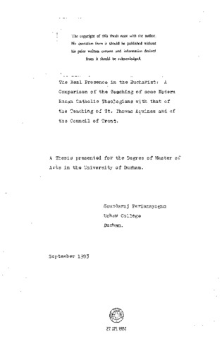 The Second Vatican Council and the subsequent teaching given by Pope Paul VI have certainly led to fresh developments in the Church's understanding of the sacraments and of their necessity as the principal means of sanctification, both in the economy of the Church and in the life of the individual Christian. If this is the case with sacraments in general, it is much more so with regard to the Holy Eucharist, in which (according to traditional Roman Catholic teaching) the Lord gives himself, body, blood, soul and divinity really and truly under the sign of sacramental bread and wine for the nourishment and building up of the Church. Some modern Roman Catholic theologians (Schoonenberg, Schillebeeckx, Rahner) and the New Dutch Catechism have tried to re-express this doctrine of the Real Presence of the Lord in the Eucharist, in such a way as to be understood by the modern man. They have suggested substituting new terms like 'transfinalization and 'transsignification' for the traditional word 'transubstantiation', to denote the Real Presence of the Lord in the Eucharist. These new approaches, as might have been expected, found a different reception in different parts of the Church. The ensuing controversy naturally provoked an official response, which was given in the form of an encyclical Mysterium Fidei by Pope Paul VI, where he encourages the theologians to be faithful to the official teaching of the Church and presents Thomas Aquinas as the model. In this thesis, I have undertaken to compare the opinions of the modern theologians with that of the Decree of the Council of Trent and the opinion of St. Thomas. Trent gives official doctrine, and the Summa of Thomas is the best example of theologizing. Keeping this in mind, this thesis is divided into nine chapters. Chapter I comprises a brief summary of the opinions of the above-mentioned theologians. Chapter II is a survey of the doctrine in the Early Middle Ages. Chapters III, IV and V examine the teaching of Thomas at considerable length. Chapter VI gives a bird's eye-view of the Eucharistic controversies from the Fourteenth to the Sixteenth Century. This leads us into Chapters VII and VIII which deal with the council on Trent. Finally, Chapter IX compares the opinions of the modern theologians with that of the decree of the council of Trent and of the teaching of St.Thomas.